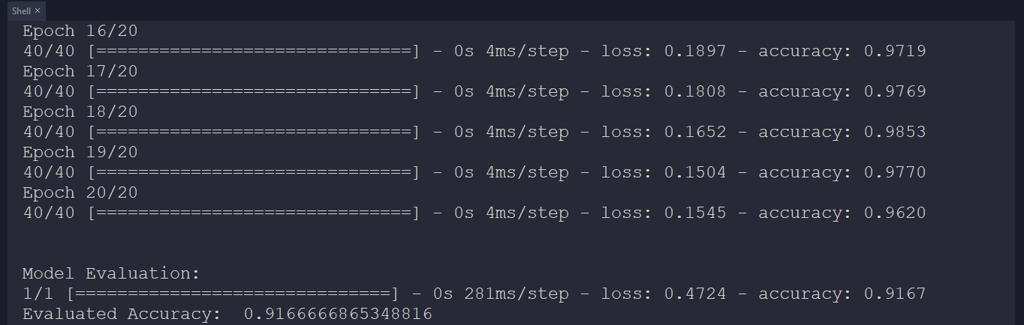 My neural network model predicts possibilities of labels (irrigation classes) for each given input (thermal imaging array) as an array of 4 numbers. They represent the model's "confidence" that the given input array corresponds to each of the four different irrigation classes based on thermal imaging [0 - 3], as shown in Step 5: