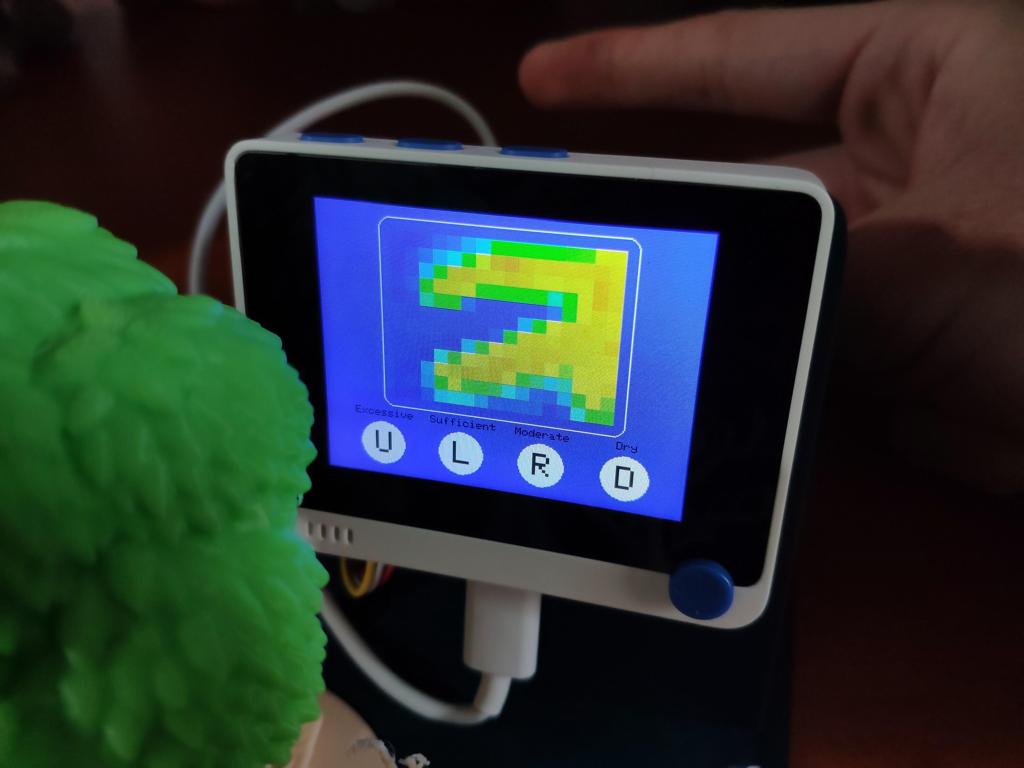🌿💧 If the 5-way switch is pressed, the device runs inference with the model by employing the most recently generated thermal imaging array as the input array.