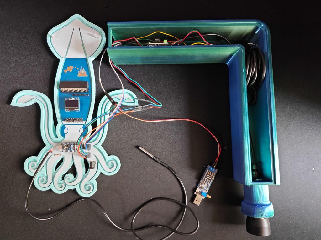 Finally, to make the device as robust and compact as possible, I designed a complementing Aquatic-themed case (3D printable) with a modular holder encasing the PCB outline, a hang-on aquarium connector mountable to the PCB holder, a hang-on camera holder to place the high-quality USB webcam when standing idle, and a removable top cover allowing the user to attach sensors to the assigned slots. The semicircular-shaped mounting brackets are specifically designed to contain the waterproof temperature sensor.