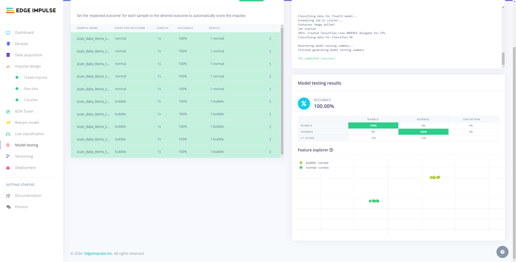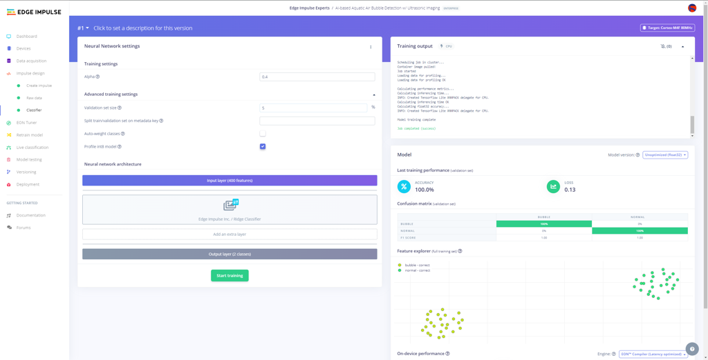 After completing constructing my ultrasonic scan data set, I built my artificial neural network model (ANN) with Edge Impulse to identify noxious air bubbles lurking in the underwater substrate. Considering the unique structure of ultrasonic imaging data, I employed the built-in Ridge classifier as the model classifier, provided by Edge Impulse Enterprise. As a logistic regression method with L2 regularization, the Ridge classification combines conventional classification techniques and the Ridge regression for multi-class classification tasks. Since Edge Impulse is nearly compatible with all microcontrollers and development boards, even for complex Sklearn linear models, I have not encountered any issues while uploading and running my advanced model on Nano ESP32. As labels, I simply differentiate the ultrasonic scan samples depending on the underwater air bubble presence: