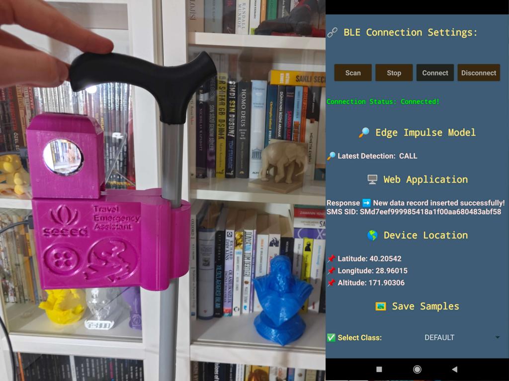 📲 ♿ 🌎 After connecting to XIAO ESP32S3 over BLE via the Android application successfully, the user can utilize the assistive device to detect customized keychains (tokens) representing an emergency class (label).