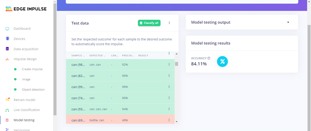 With the testing dataset (approximately 50 images), Edge Impulse evaluated the model accuracy as 84.11%.