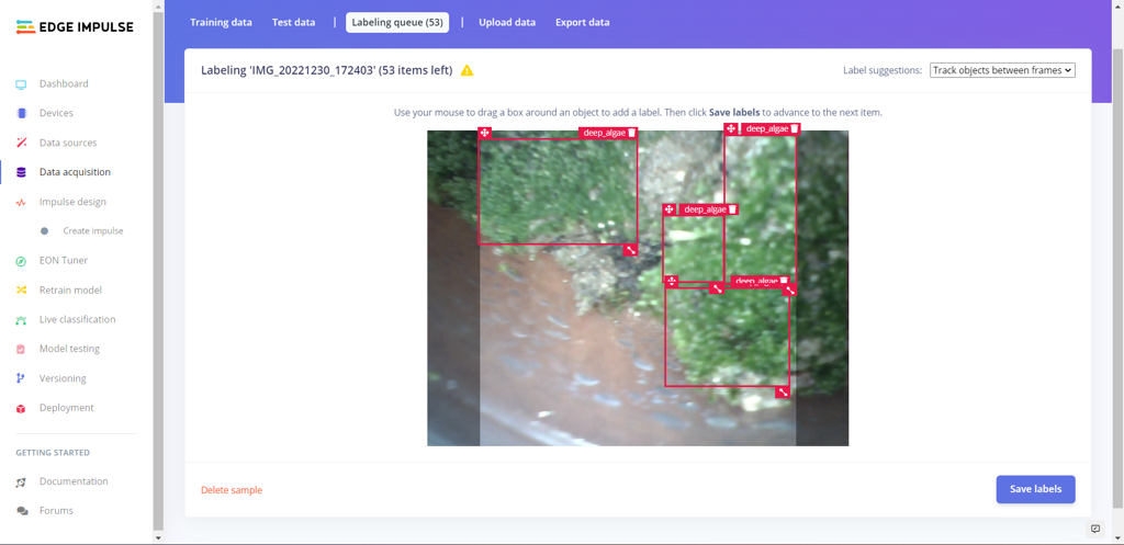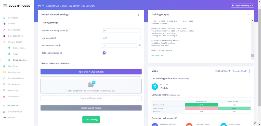 After completing my data set by taking pictures of existing deep algae bloom, I built my object detection model with Edge Impulse to predict potential algal bloom. I utilized Edge Impulse FOMO (Faster Objects, More Objects) algorithm to train my model, which is a novel machine learning algorithm that brings object detection to highly constrained devices. Since Edge Impulse is nearly compatible with all microcontrollers and development boards, I had not encountered any issues while uploading and running my model on Raspberry Pi.