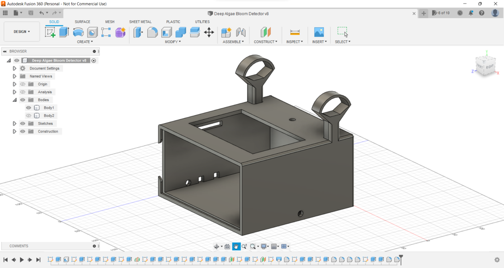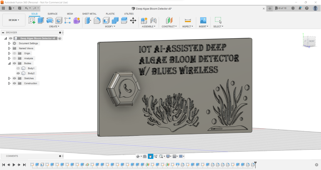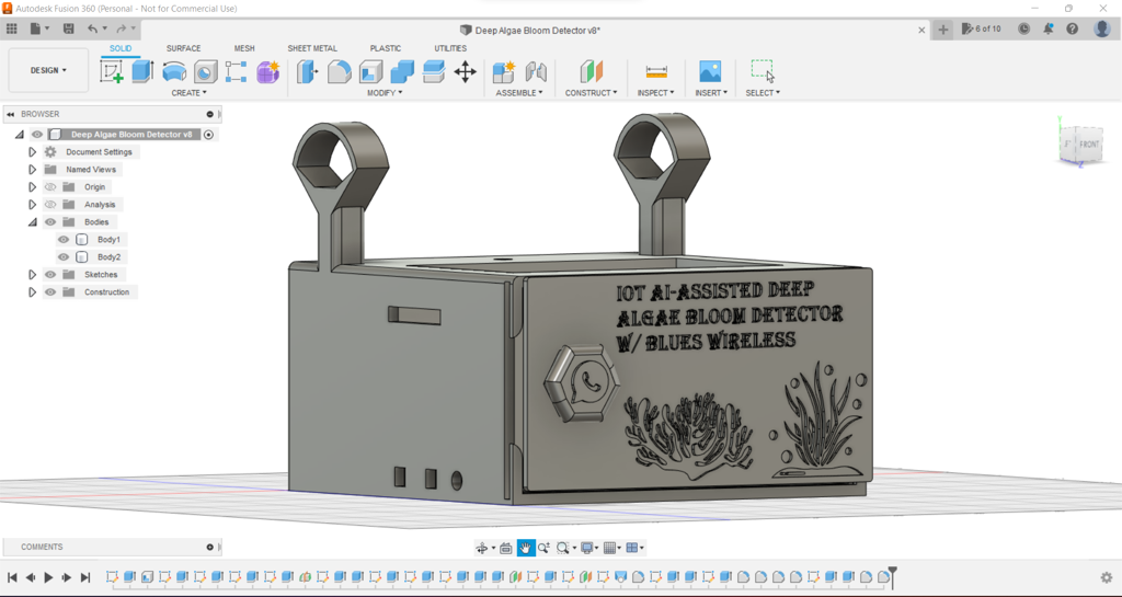 Since I focused on building a budget-friendly and accessible device that collects data from water bodies and informs the user of detected deep algae bloom via WhatsApp, I decided to design a robust and compact case allowing the user to utilize water quality sensors and the borescope camera effortlessly. To avoid overexposure to dust and prevent loose wire connections, I added a sliding front cover with a handle to the case. Then, I designed two separate supporting mounts on the top of the case so as to hang water quality sensors and the borescope camera. Also, I decided to emboss algae icons on the sliding front cover to highlight the algal bloom theme.