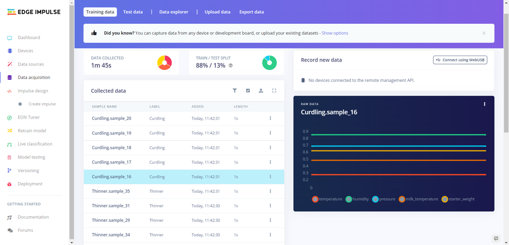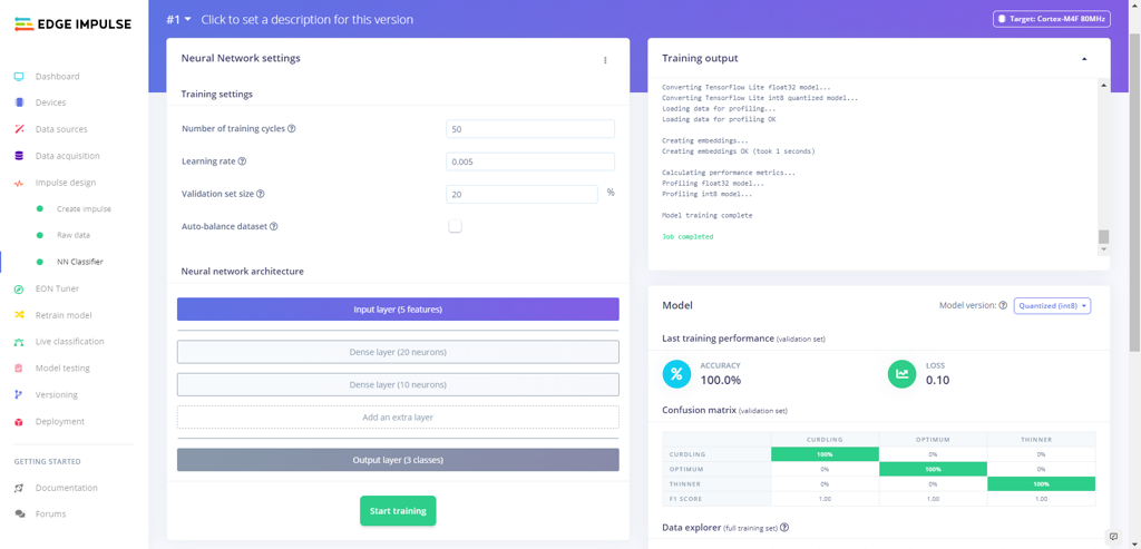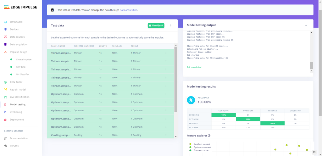 After completing my data set, I built my artificial neural network model (ANN) with Edge Impulse to make predictions on yogurt consistency levels (classes). Since Edge Impulse is nearly compatible with all microcontrollers and development boards, I had not encountered any issues while uploading and running my model on XIAO ESP32C3. As labels, I utilized the empirically assigned yogurt texture classes for each data record while collecting yogurt processing data: