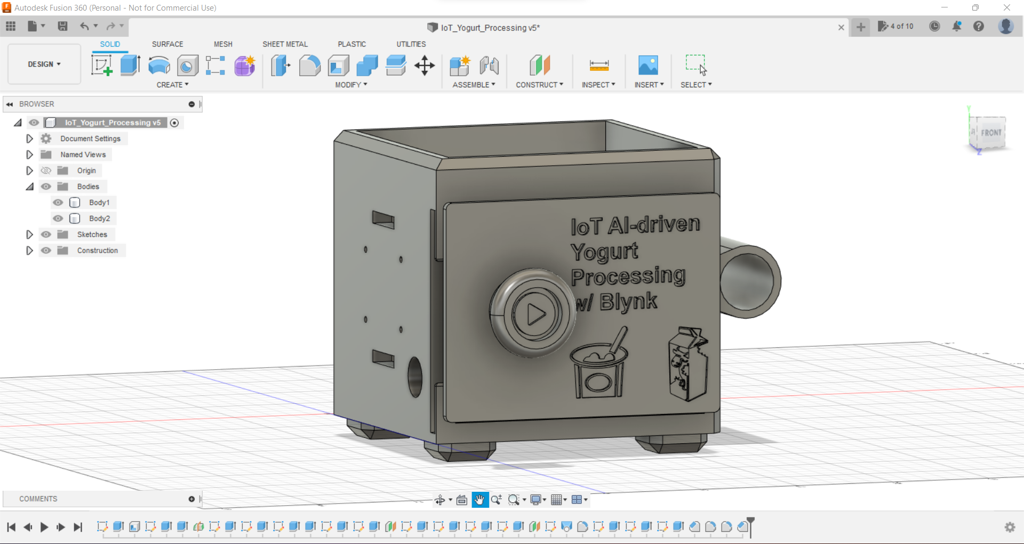 Since I focused on building a budget-friendly and easy-to-use device that collects yogurt processing data and informs the user of the predicted yogurt consistency level before fermentation, I decided to design a robust and sturdy case allowing the user to access the SD card after logging data and weigh yogurt culture (starter) easily. To avoid overexposure to dust and prevent loose wire connections, I added a sliding front cover with a handle to the case. Also, I decided to emboss yogurt and milk icons on the sliding front cover so as to complement the dairy theme gloriously.