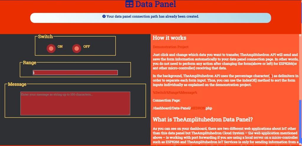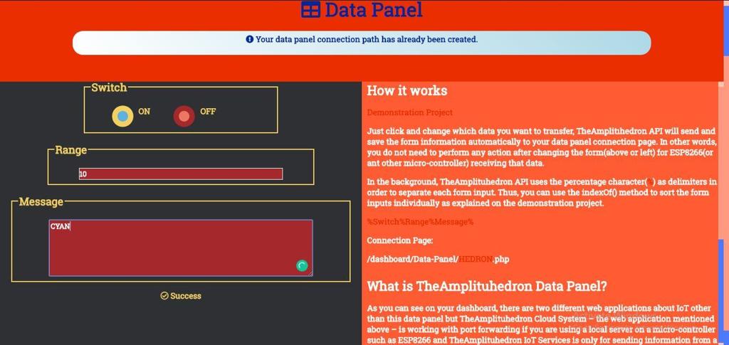 You can get three different variables from TheAmplituhedron Data Panel – Switch, Range and Message. Switch is a pre-defined button, which can be ON or OFF. Range is an integer from 0 to 255, which you can use as limit or PWM input. Message is a string up to 100 characters, which you can print as a message, scan for commands or use to create new substrings with the percentage character. If you are using my web application(Data Panel), you can view these variables on the serial port.