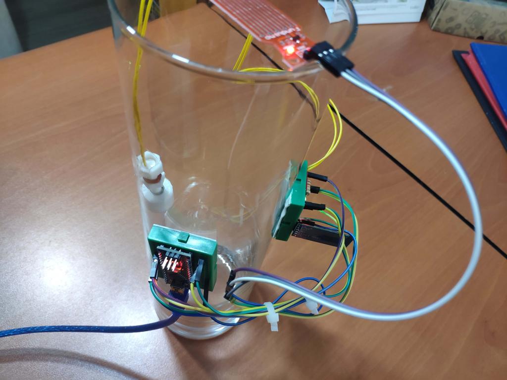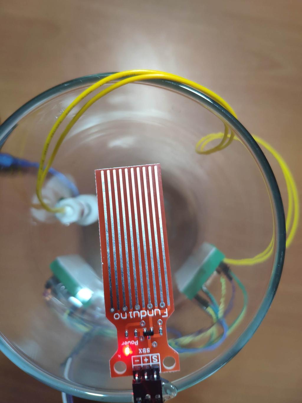 I decided to use an old bottle to detect the water integrity and the water level; I placed the Funduino Water Sensor on the top of it to measure the water integrity between 0 and 10 by mapping the analog signal pin value, as explained in the source code below. And, to detect whether the water level is below or above the threshold, I attach the water level switch in the bottle with a hot glue gun as depicted below.