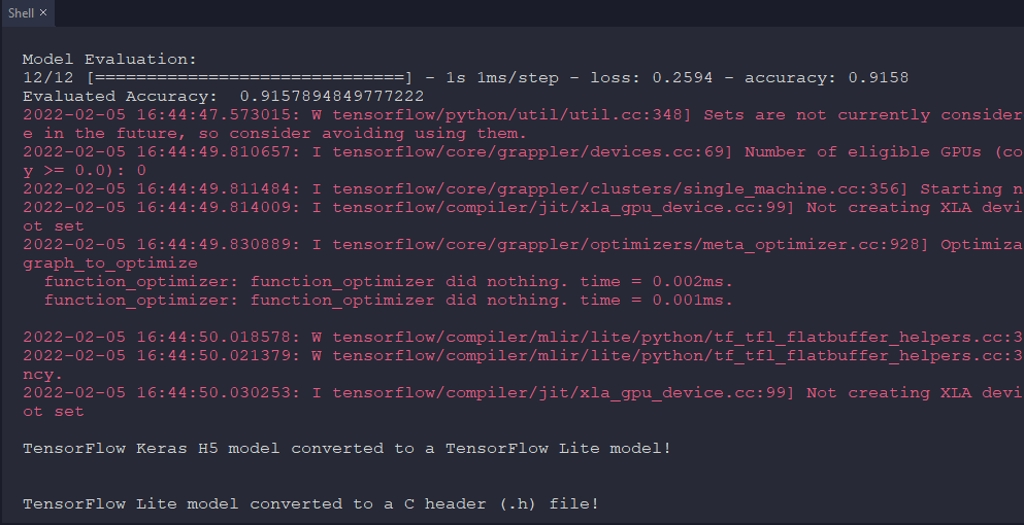 Thus, I converted my neural network model from a TensorFlow Keras H5 model (.h5) to a TensorFlow Lite model (.tflite). Then, I modified the TensorFlow Lite model to create a C array (.h file) to run the model on the Nano 33 BLE successfully.