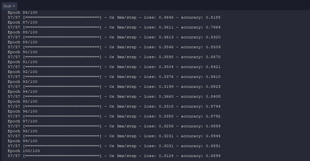 After training with the training set (inputs and labels), the accuracy of my neural network model is between 0.83 and 0.89.
