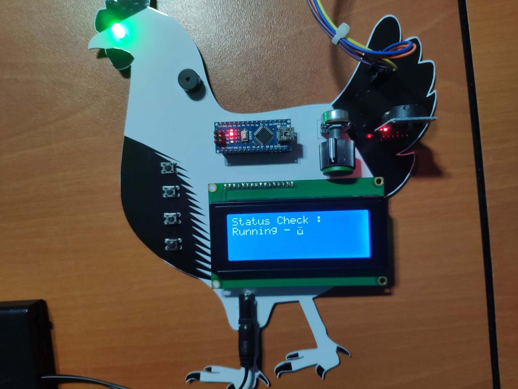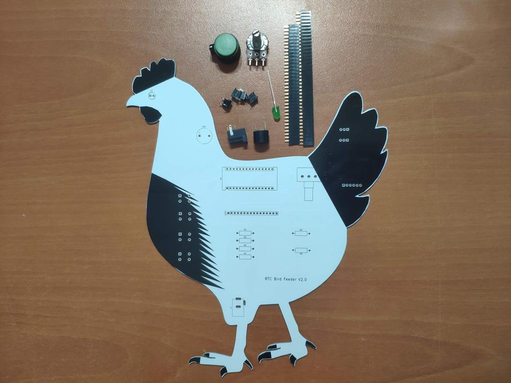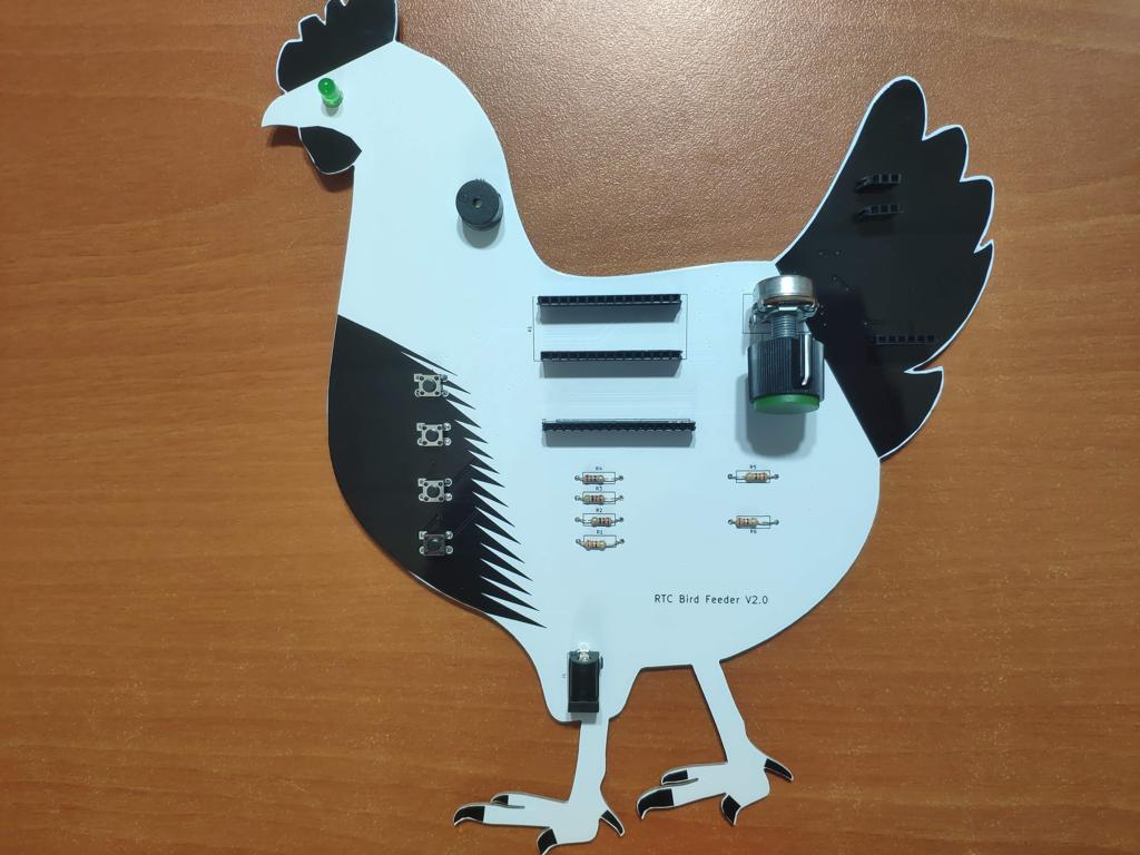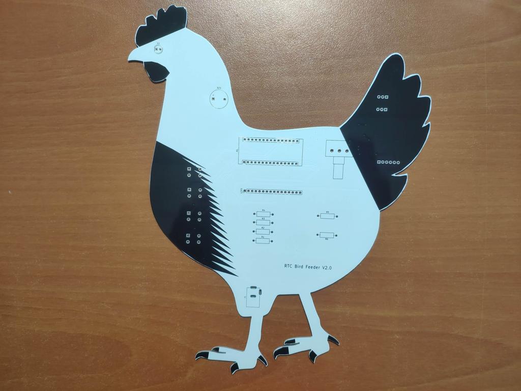 After completing my design on a breadboard and testing the code, I designed a PCB (RTC Bird Feeder V2.0) with a unique chicken shape to create a felicitous and easy-to-use accessory to any chicken coop.