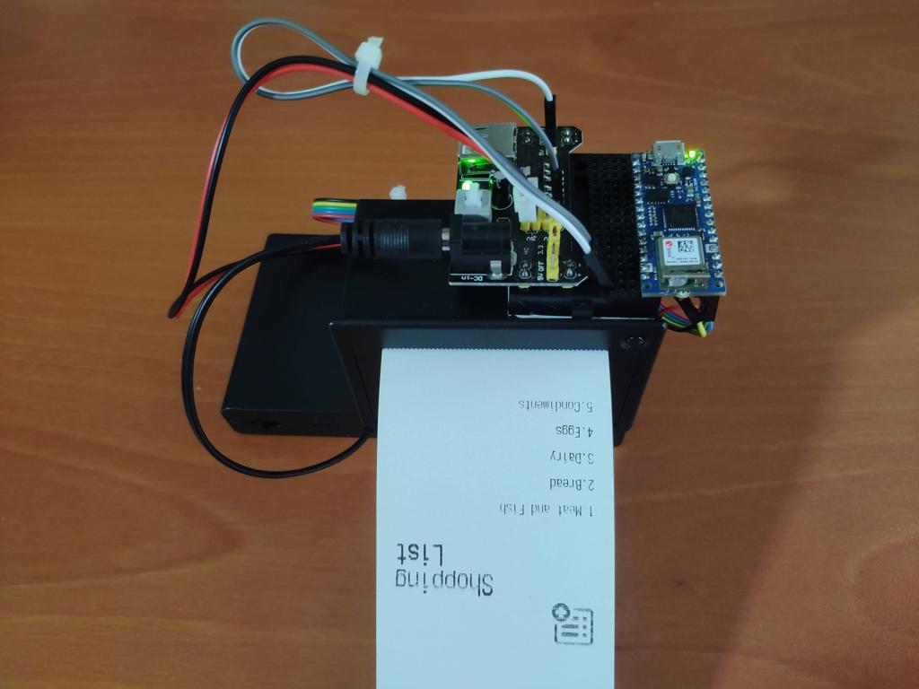 Then, to receive commands from the webhook and print out records with graphics (bitmaps) for each category mentioned above, I used an Arduino Nano 33 IoT and a tiny (embedded) thermal printer.
