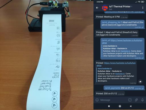 Via Telegram, control thermal printers remotely to print out notes, shopping lists, URLs, payments, product barcodes, and episode release dates.