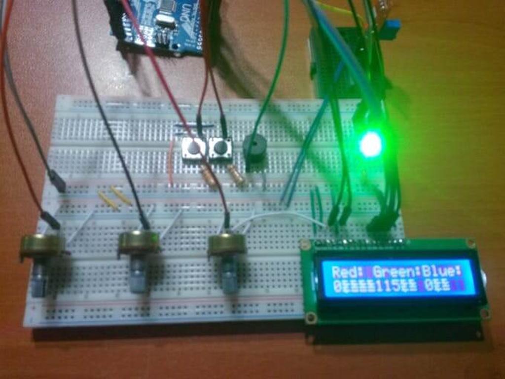 Also, you can see the results on LCD screen when you adjust the number from 0 to 255 by clicking the first button. Moreover, you can use the device as an RGB picker and create special colours.